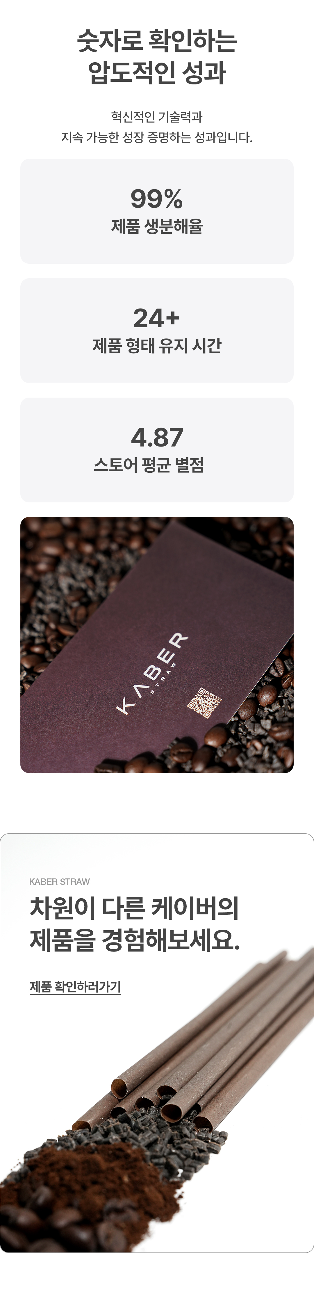 당신의 일상에서 버려지는 커피 폐기물을 새로운 가치를 창출하는 자원으로 바꿔보세요.지금껏 경험하지 못한 혁신적이고 지속 가능한 친환경 솔루션,Kaber와 함께라면 미래가 더 아름답습니다.