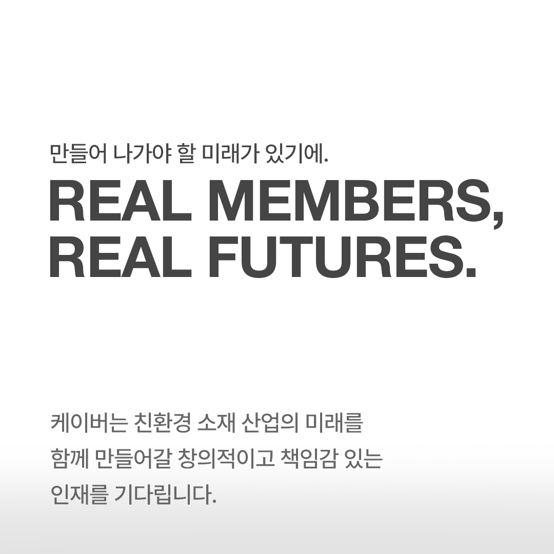 케이버는 친환경 소재 산업의 미래를 함께 만들어갈 창의적이고 책임감 있는 인재를 기다립니다.