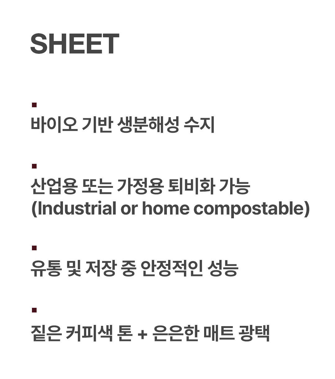 Pellet | BPSL20CG | PLA 기반, 커피박 첨가, 고강도 · 낮은 비용, 짙은 커피색 + 은은한 매트광 | 식품 포장용 시트, 컵 슬리브 | Industrial Compostable |