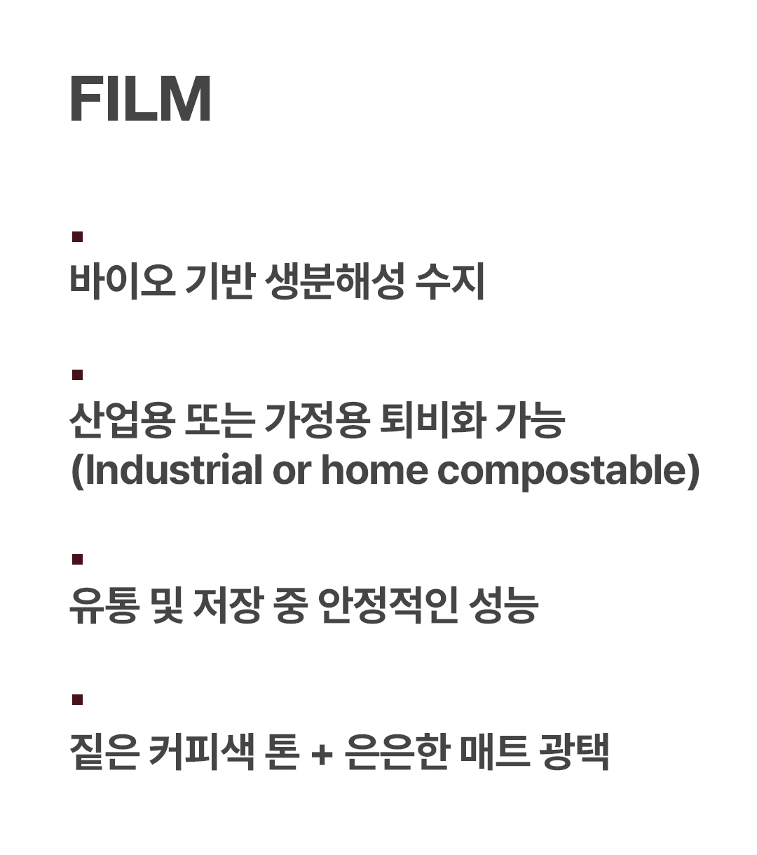 Pellet | BPFL20CG | PLA 기반, 커피박 첨가, 고강도 · 낮은 비용, 짙은 커피색 + 은은한 매트광 | 멀칭 필름 | Industrial Compostable |